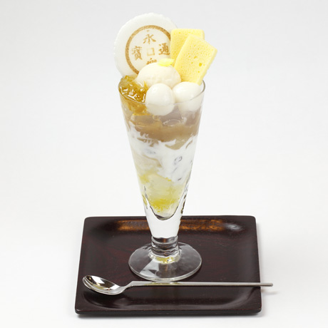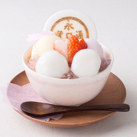 3.1から4.30までの限定メニュー。桜アイス、桜餡、桜ゼリーを使用した桜づくしのパフェです。大きな白玉が2つ入っているのも嬉しい!具材1つ1つの美味しさは、和菓子屋さんの丁寧な仕事ぶりならでは。