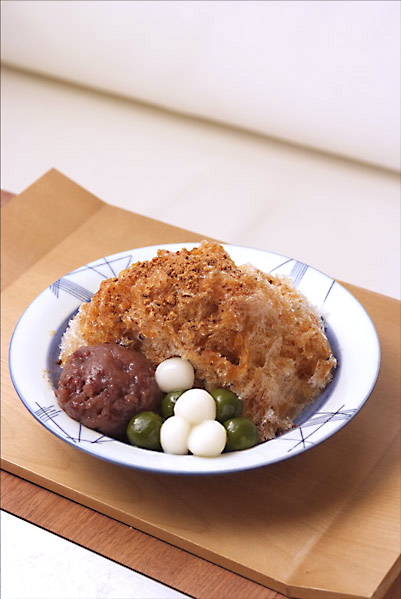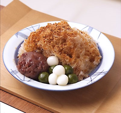 俵屋吉富の名物かき氷「白玉黒糖金時(945円)」は、さすが名物と言われるだけあって、氷はきめが細かく、なめらかな口あたり。また黒糖は沖縄産のものを使っており、コク深い味わいとあっさりした後味がたまらない一品です。