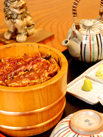「名物 お櫃うなぎ茶漬」とはひつまぶしのこと。一杯目はそのままうな丼、二杯目は薬味をのせて、三杯目はお茶漬け、と三つの味が楽しめます。