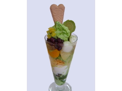 「古都の恋心パフェ(880円)」は、自家製の宇治茶ソフトに、たっぷりのフルーツ、抹茶寒天、手づくり抹茶ケーキ、さらにわらびもちも入ってます。