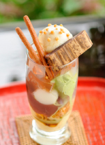 「中谷パフェ(950円)」は、名物「でっち羊羹」入りの和洋折衷!?のパフェです。そのほかに豆乳プリン・お茶寒天・とうふ羊かん・白玉・バニラアイス・抹茶ジェラートと最後のひとくちまで色んなお味が楽しめます。