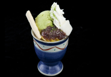 お茶の老舗の名物「抹茶パフェ(830円)」は、まろやかな抹茶アイスとバニラのアイスがたっぷり。そのほか、寒天、あん、生クリーム・・なかでも大粒の栗の甘露煮がうれしい一品。