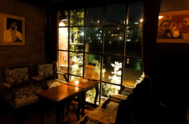 レトロで大人の雰囲気が漂う店構えで、先斗町でひときわ目につくジャズバー。鴨川沿いなので店内からの景色も抜群。
