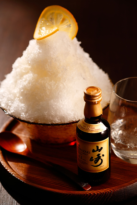 レモンの酸味と優しい甘みの自家製シロップが、個性的な深みのある「山崎」の味わいを引き立てる、大人のためのかき氷。最後は炭酸水をかけてハイボールに!「みぞれ白州」もあります。