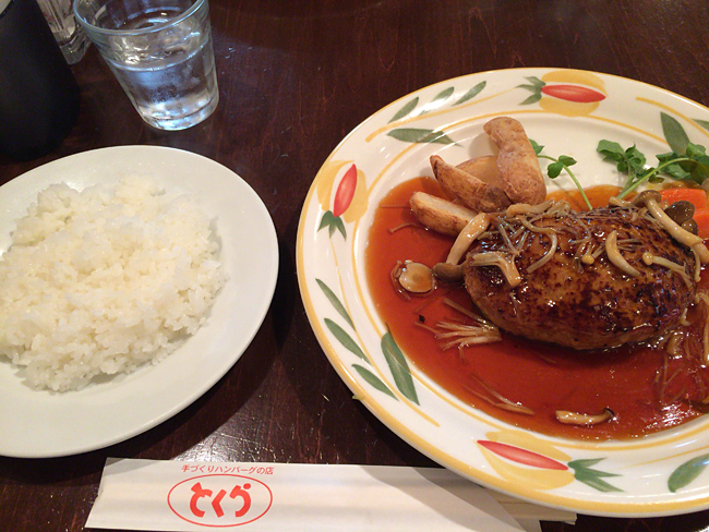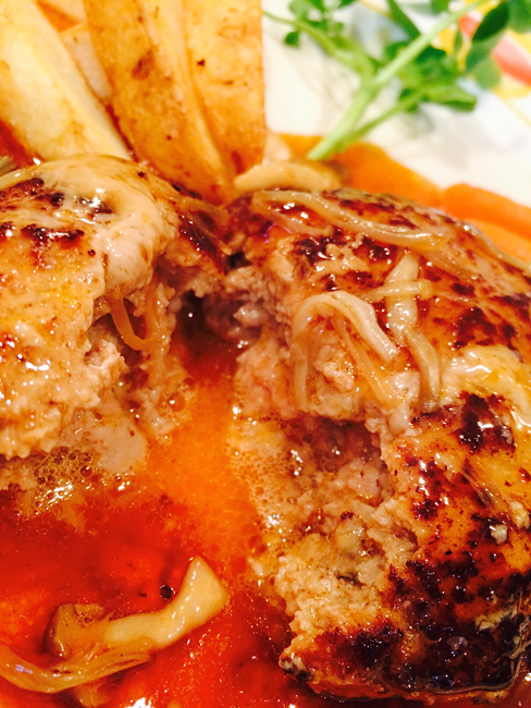 お箸を入れた瞬間、お皿いっぱいに肉汁が溢れ出す!しっかりしたお肉の味が楽しめるお店です。イチオシは照り焼ききのこハンバーグ。