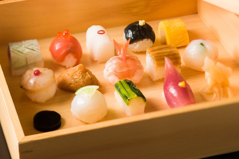 舞妓さんのお口に合わせた小さなお寿司「豆すし」が人気です。手毬寿しよりも小さいおちょぼサイズです。