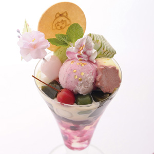 薄紅色の桜アイスの他に、抹茶とバニラアイスものっている豪華なパフェです。お店は八坂神社のすぐそばなので、円山公園でお花見した後に桜パフェを食すという贅沢もできます。
