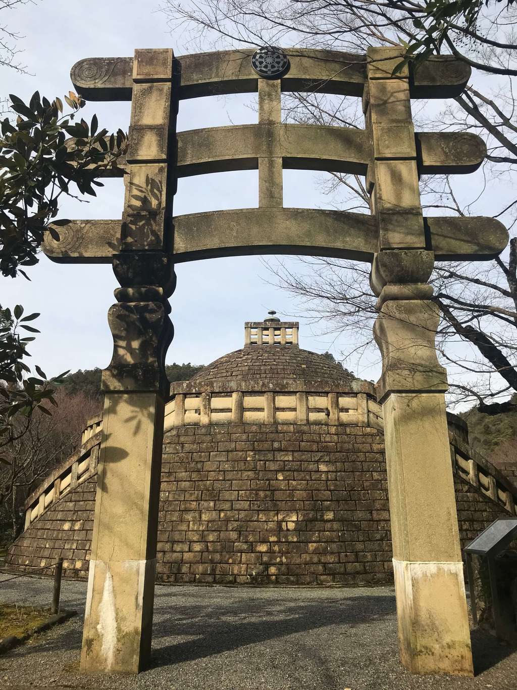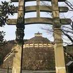 そして、その仏舎利塔の入口には鳥居の上の横木部分が3段重なったような鳥居があります。