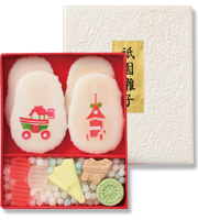 「祇園囃子」は、麩焼製「長刀鉾」「大船鉾」や打物・干琥珀など彩りよくお詰合せ。
