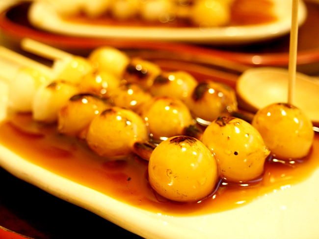 大正11年(1922年)創業。下鴨神社・糺の森にある井上の社の「御手洗池(みたらしのいけ)」で、後醍醐天皇が水をすくった際、泡がまずひとつ浮き、その後に4つ続けて浮き上がったという鎌倉時代の言い伝えにちなんだ団子に、初代・中村弥三郎が甘辛のタレを考案したところ、人気を博したそうです。その形は、五体(頭と四肢)を表わすともされています。お店の場所は、下賀茂神社のすぐそば、下賀茂本通り沿いの西側。糺の森を散策した後に、ちょっと寄るのに良いお茶屋さんです。