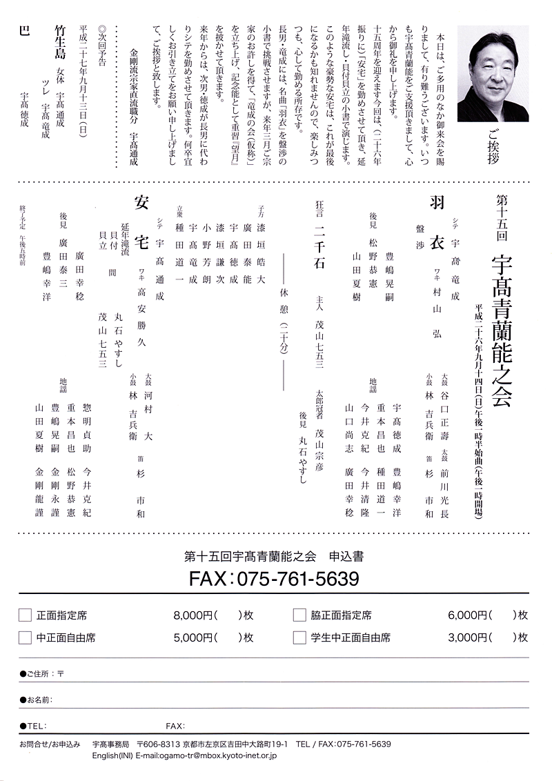 能 「羽衣 盤渉」 宇高竜成 狂言 「二千石」 茂山七五三 能 「安宅 延年滝流・貝付貝立」 宇高通成 |